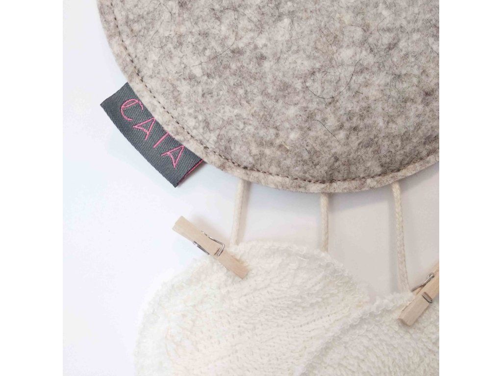 Anyaga: Gyapjú-viszkóz vagy 100% poliészter, pamut és poliészter kiegészítőkkel + kis fa csipeszek.